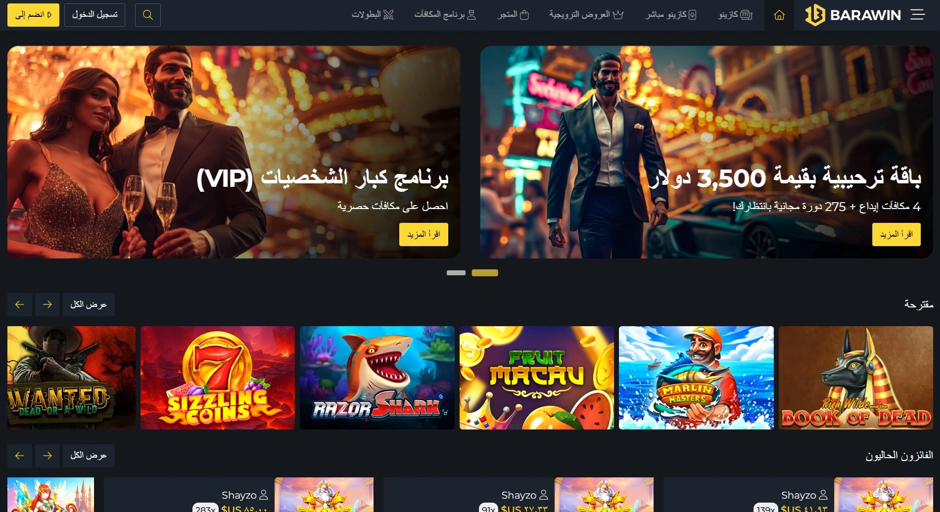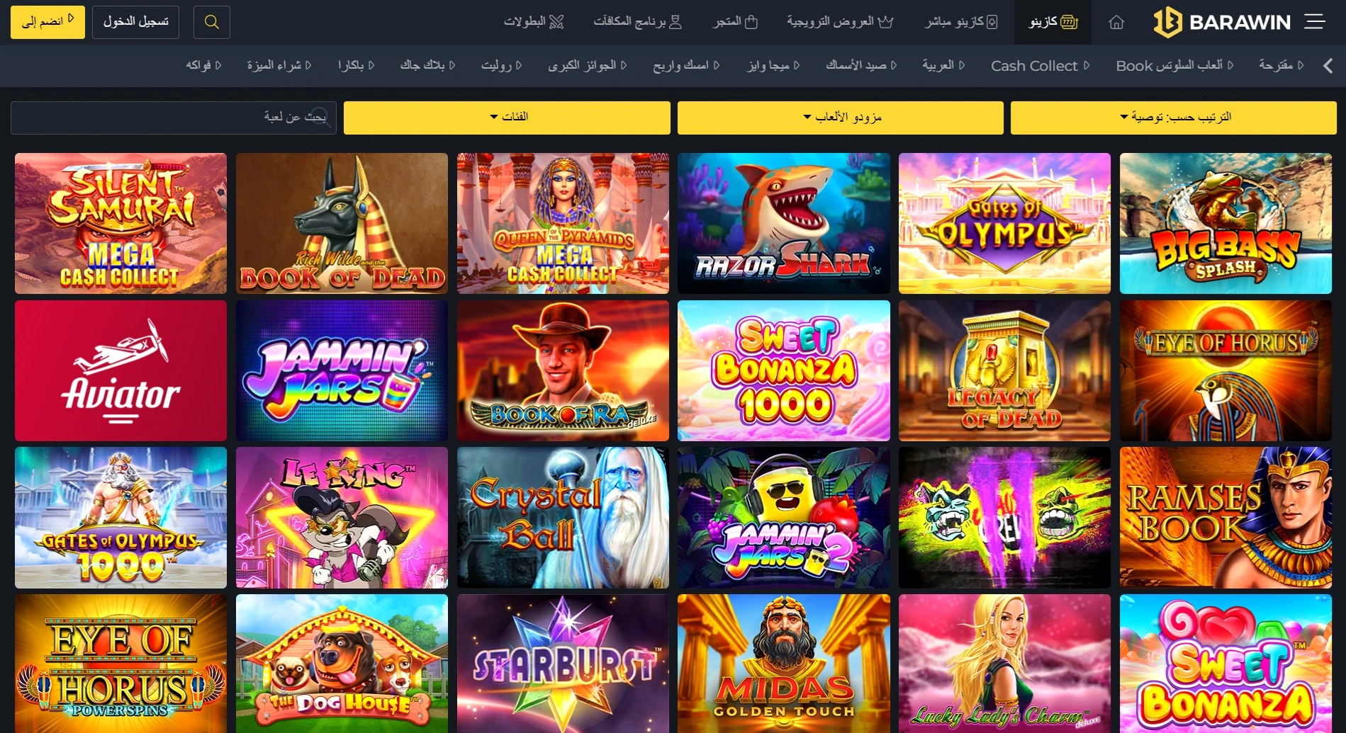 من بين أشهر السلوتات المتوفرة: Big Bass Bonanza، Gates of Olympus 1000، Book of Dead، Sweet Bonanza، Wolf Gold، والعديد من الألعاب ذات الجوائز التقدمية. معدلات RTP تتراوح عموماً بين 94% و98% حسب اللعبة. ماكينات القمار ذات عائد مرتفع من Barawin توفر فرصاً جيدة للأرباح على المدى الطويل.