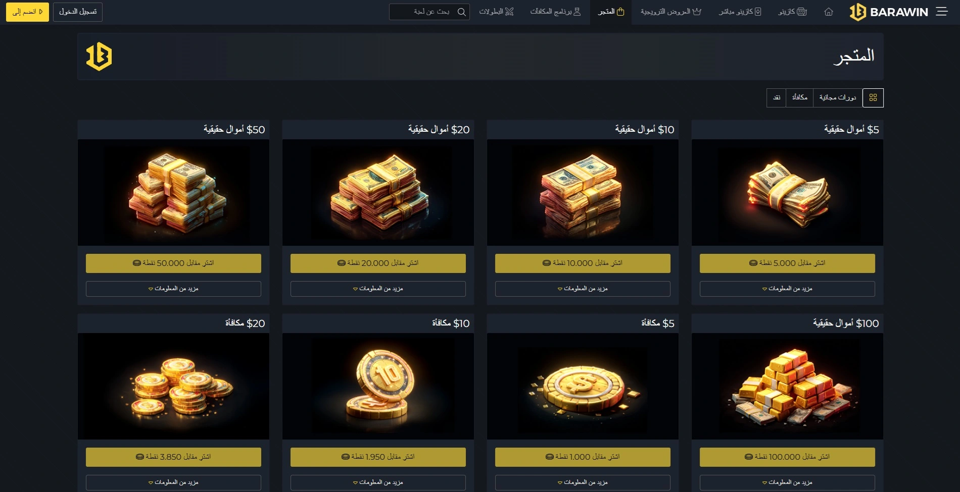 متجر المكافآت في Barawin يتيح للاعبين استبدال نقاط الولاء المتراكمة بمكافآت عملية داخل الكازينو. النقاط تُكسب تلقائياً من خلال الرهان بأموال حقيقية، ويمكن مراقبتها في أي وقت من رصيد حسابك. المتجر يقدم ثلاث فئات رئيسية: النقد، المكافآت، والدورات المجانية.