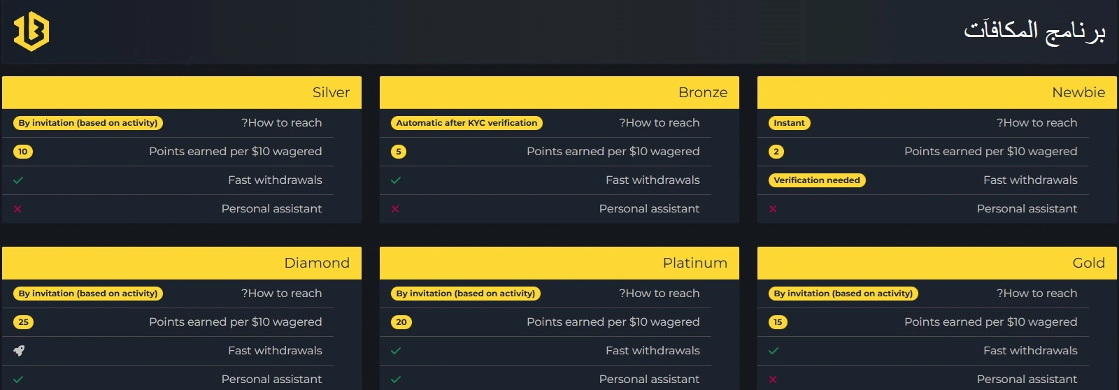 تصبح عضواً في البرنامج تلقائياً من لحظة التسجيل في مستوى Newbie. بعد التحقق من حسابك (KYC)، تنتقل تلقائياً إلى مستوى Bronze. المستويات الأعلى (Silver، Gold، Platinum، Diamond) تتطلب دعوة من فريق إدارة VIP بناءً على نشاطك في اللعب.